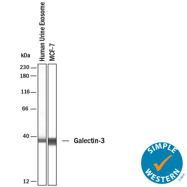 Detection of Human Galectin‑3 by Simple WesternTM. Simple Western lane view shows lysates of Exosome Standards (Human Urine) (NBP2-49840) and MCF‑7 human breast cancer cell line, loaded at 0.5 mg/ml. A specific band was detected for Galectin‑3 at approximately 37 kDa (as indicated) using 10 µg/ml of Goat Anti-Human Galectin‑3 Antigen Affinity-purified Polyclonal Antibody (Catalog # AF1154) followed by HRP-conjugated Donkey Anti-Goat Secondary Antibody (Catalog # 042-206). This experiment was conducted under reducing conditions and using the 12-230kDa separation system.