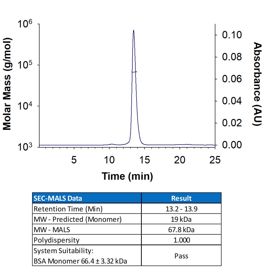 Recombinant Human CD74 Protein (Catalog # 3590-CDB) has a molecular weight (MW) of 67.8 kDa as analyzed by SEC-MALS, suggesting that this protein is a homotrimer. MW may differ from predicted MW due to post-translational modifications (PTMs) present (e.g. Glycosylation).